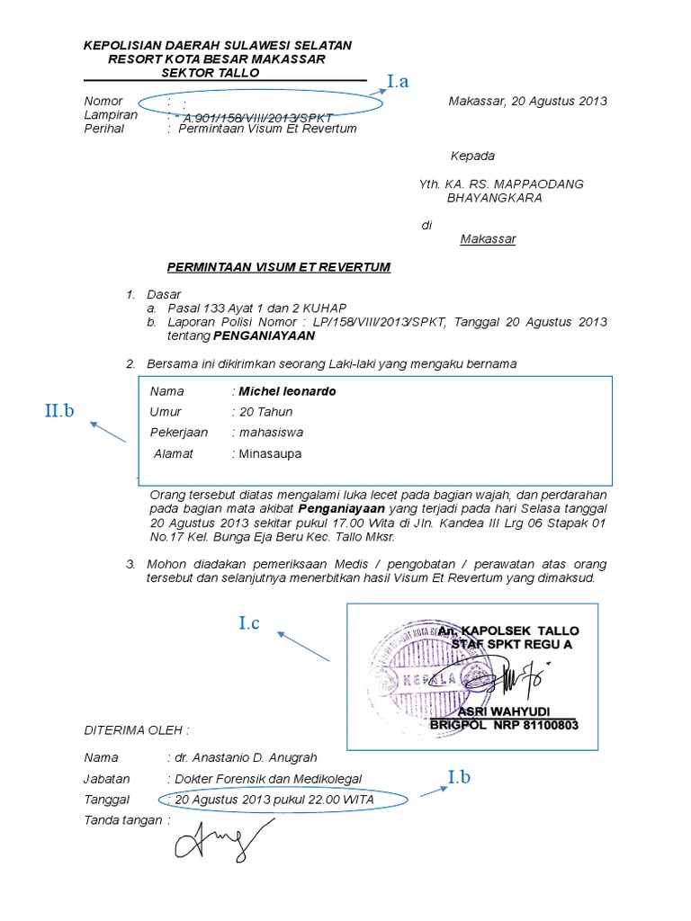 Contoh Surat Visum Et Repertum Academia edu is a platform for academics to share research papers. Contoh Surat Permintaan Visum Dari Penyidik Your sincerely the undersigned please choose one of the following. Bambang projustitia visum et repertum yang bertanda tangan di bawah ini servasius suwaldus situ dokter ahli kedokteran forensik pada bagian ilmu kedokteran forensik fakultas ukrida jakarta menerangkan bahwa atas permintaan. Download full pdf package. Contoh surat visum et repertum. Contoh surat undangan pemberitahuan lomba sekolah.